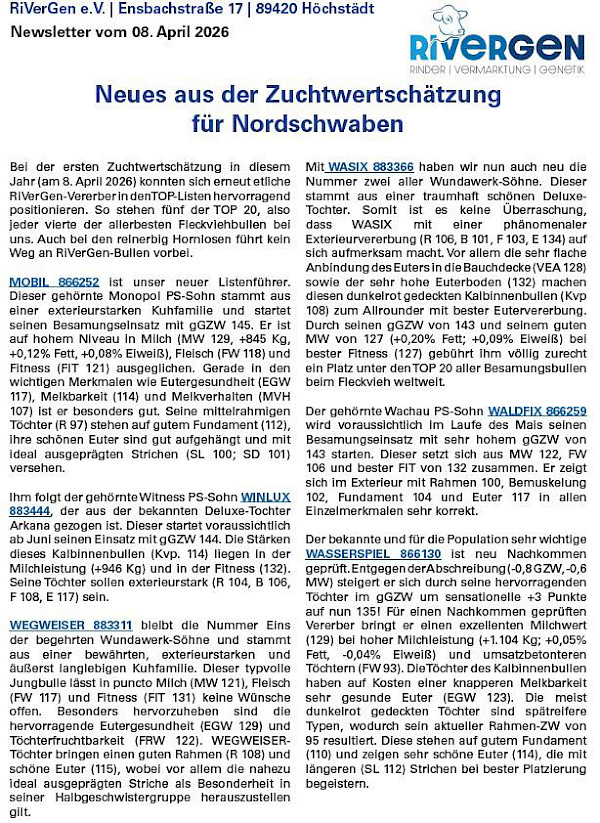 Der RiVerGen e.V. ist seit dem 19.09.2023 der neue Verein in der Fleckviehzucht. Er ist ein Zusammenschluss des Zuchtverband für das Schwäbische Fleckvieh e.V. Wertingen und dem Besamungsverein Nordschwaben e.V. in Höchstädt.