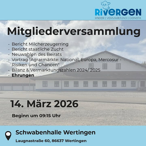 Die RiVerGen wird der Veranstalter der VFR-Tierschau am 15.11.2025 in Wertingen sein. Aktuell planen wir Ihnen für diese Tierschau ein abwechslungsreiches und attraktives Angebot zu machen, in dem die Präsentation der Bullen auch eine Rolle spielen kann. Weiterhin wollen wir Ihre Aufmerksamkeit auf diese Abendveranstaltung der VfR-Schau lenken, um diese zu einem absoluten Highlight im Jahr 2025 werden zu lassen.