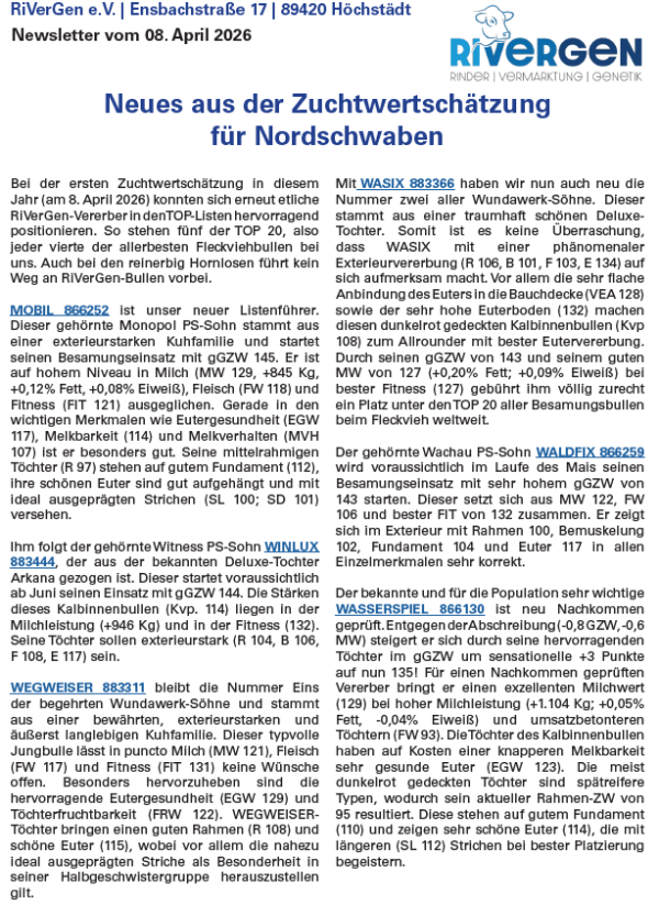 Am Samstag, den 15. November findet die VFR-Schau in Wertingen statt. Im Vorfeld bietet RiVerGen bereits um 13 Uhr eine Bullenpräsentation in Höchstädt an. Um 14 Uhr startet der Bambini-Wettbewerb. Hier dürfen die Jüngsten bei einer Kälberrallye sowie einem Vorführ- und Trikotwettbewerb ihr Können zeigen. Um 18.30 Uhr startet das Preisrichten der Kuhklassen im Rahmen einer Night-Show. Etwa 60-70 Kühe aus dem gesamten Gebiet der VFR werden sich Preisrichter Tobias Ammann aus Vorarlberg und den Zuschauern präsentieren. Als Moderatorin durchs Programm führt die ehemalige bayerische Milchkönigin Veronika Gschoßmann. Im Anschluss folgen Eliteversteigerung und der Höhepunkt - die Wahl der Miss VFR. Nach einer Tombola durch die Wertinger Jungzüchter starten der Züchterabend und die Aftershow-Party.